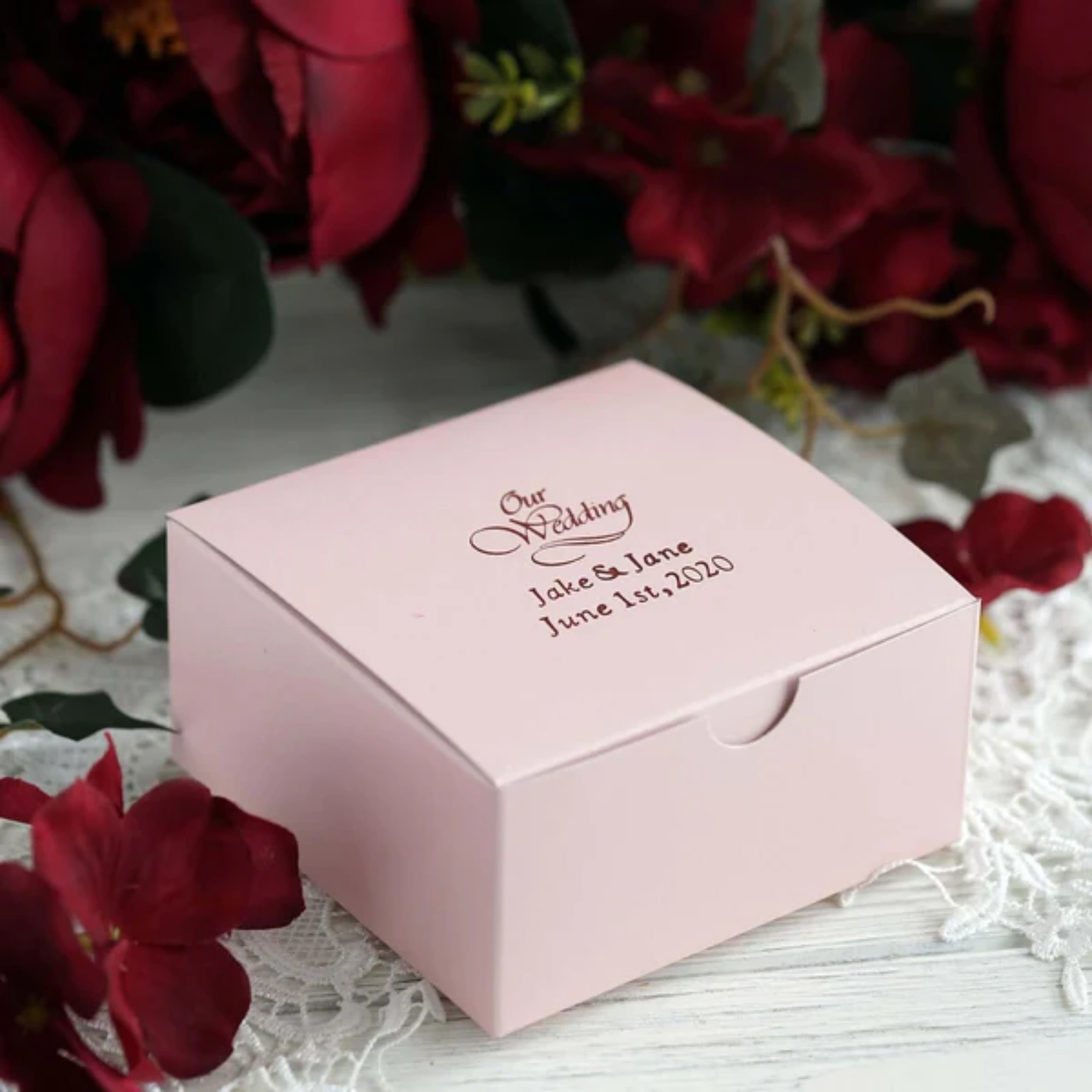 Consider the material and printing options for the wedding cake box. Choose a high-quality material and printing option that fits your wedding theme and budget.